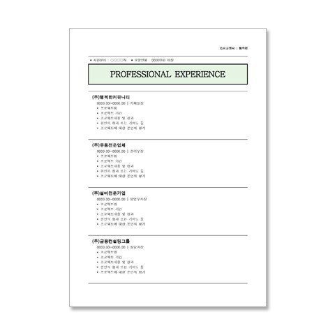 Page1 : 이력서 PERSONAL HISTORY (앞) Page2 : 이력서 PERSONAL HISTORY (뒤) Page3 : 경력기술서 PROFESSIONAL EXPERIENCE - 전 직장에서의 주요 경력을 표현할 수 있는 주요 경력 요약 Page4 : 자기소개서 SEFL-INTRODUCTION (앞) - 본인만의 스토리를 작성할 수 있는 자기소개서 양식 Page5 : 자기소개서 SEFL-INTRODUCTION (뒤) - 본인만의 스토리를 작성할 수 있는 자기소개서 양식