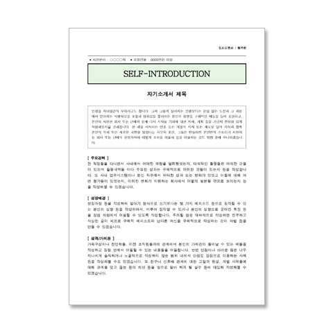 기존 문방구 이력서에서 탈피해 깔끔하면서 차별되고, 단정한 이력서를 원하시는 분들께 추천합니다. 복잡한 기능을 사용하지 않았기에 초보수준이더라도 재 편집이 가능합니다. 자기소개서 작성시 내용 작성에 대한 의견을 넣어 두었습니다.
